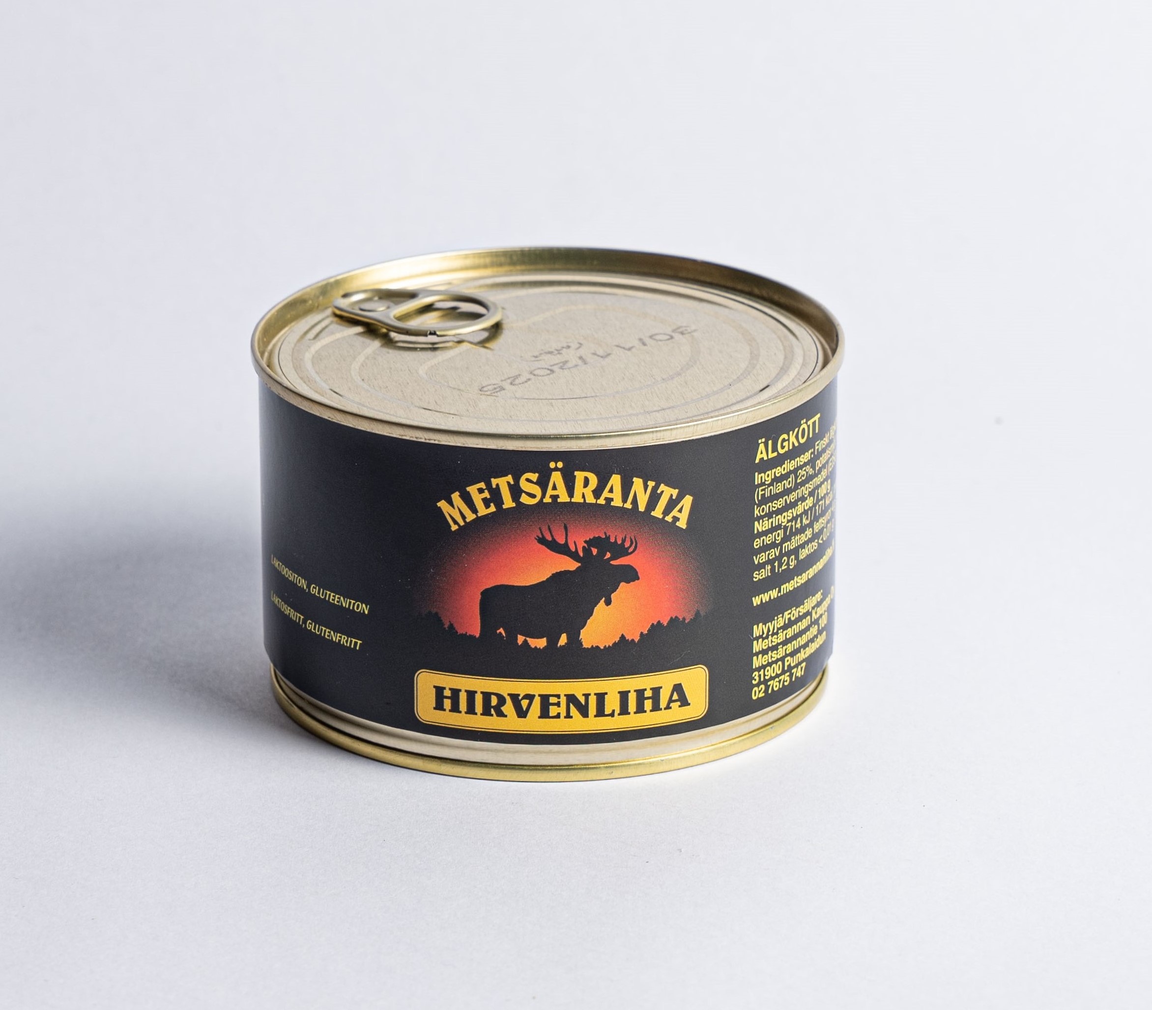 Ainesosat: Suomalainen hirvenliha 65 %, Metsärannan sianliha (Suomi) 25 %, perunajauho, vesi, suola, mausteet, gelatiini (sika), säilöntäaine E250.