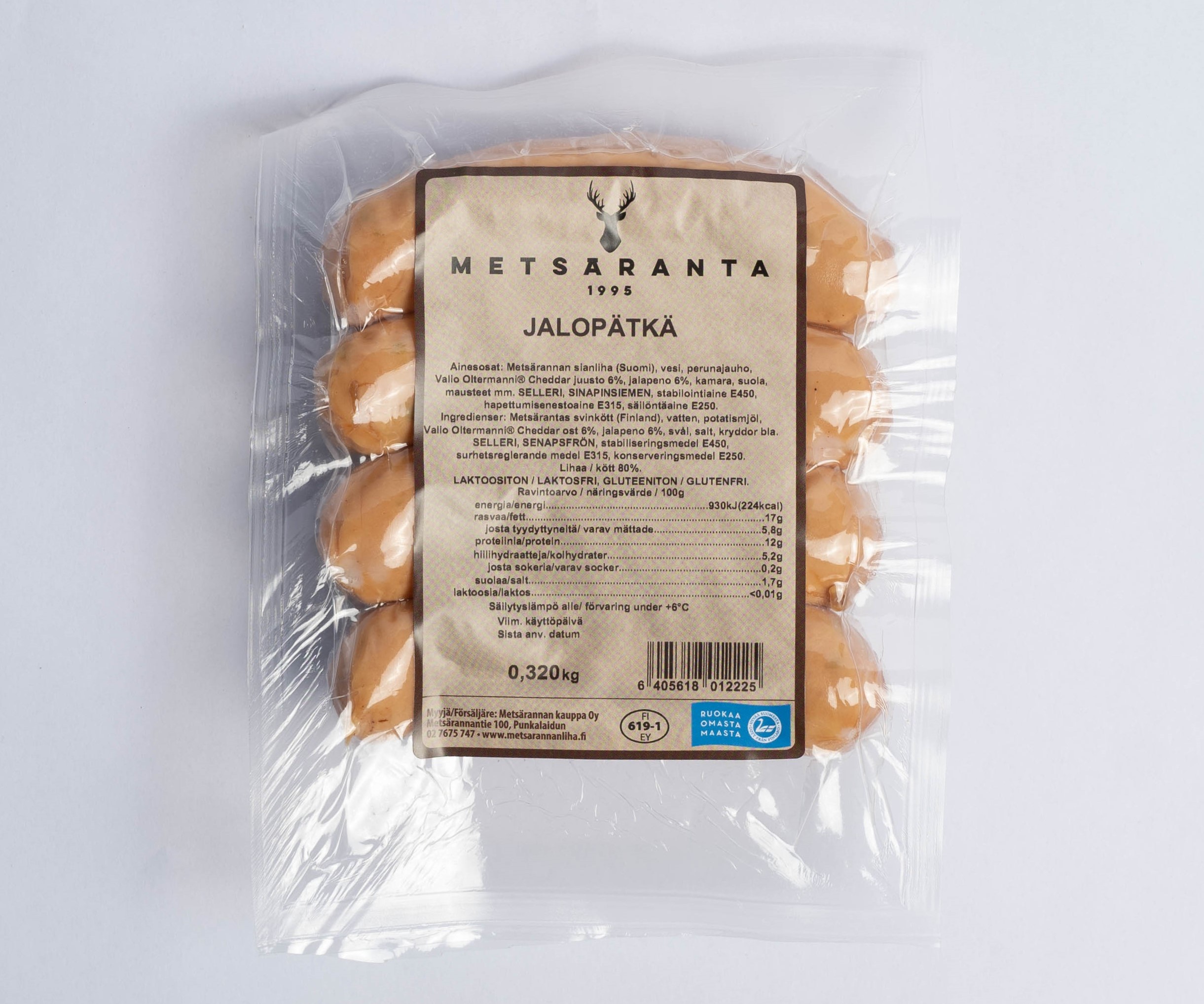 Ainesosat: Metsärannan sianliha (Suomi), vesi, perunajauho, Valio Oltermanni Cheddar -juusto 6 %, jalapeno 6 %, kamara, suola, mausteet mm. SELLERI, SINAPINSIEMEN, stabilointiaine E450, hapettumisenestoaine E315, säilöntäaine E250.